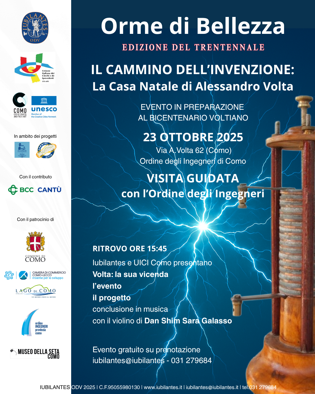 Giovedì 23 ottobre 2025 dalle 16.00 alle 18.00 IUBILANTES e UICI Unione Italiana Ciechi e Ipovedenti COMO presentano il progetto IL CAMMINO DELL’INVENZIONE a Como in via Volta 62, presso la casa natale di Alessandro Volta, ora sede dell’Ordine degli Ingegneri della provincia di Como.